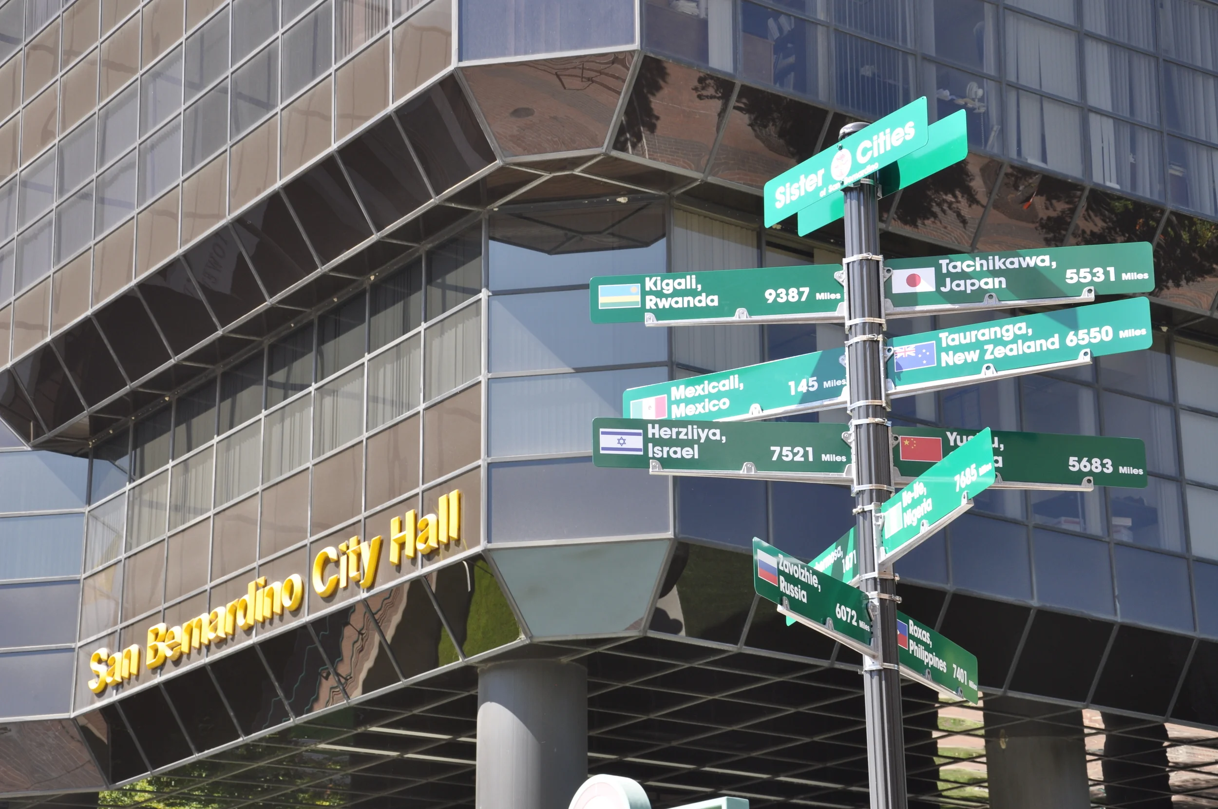 Spearheaded by Project Manager Michael R. Avila, a TSBSCC signage pole was built on top of a mosaic of the world with red tiles to indicate each of San Bernardino’s sister cities along a brick walkway leading up to San Bernardino City Hall. Each day as hundreds of people go to work, they walk by the Sister Cities Sign and find the cities on the mosaic world beneath their feet. This interactive art piece allows students and passersby to learn more about geography and their sister cities.